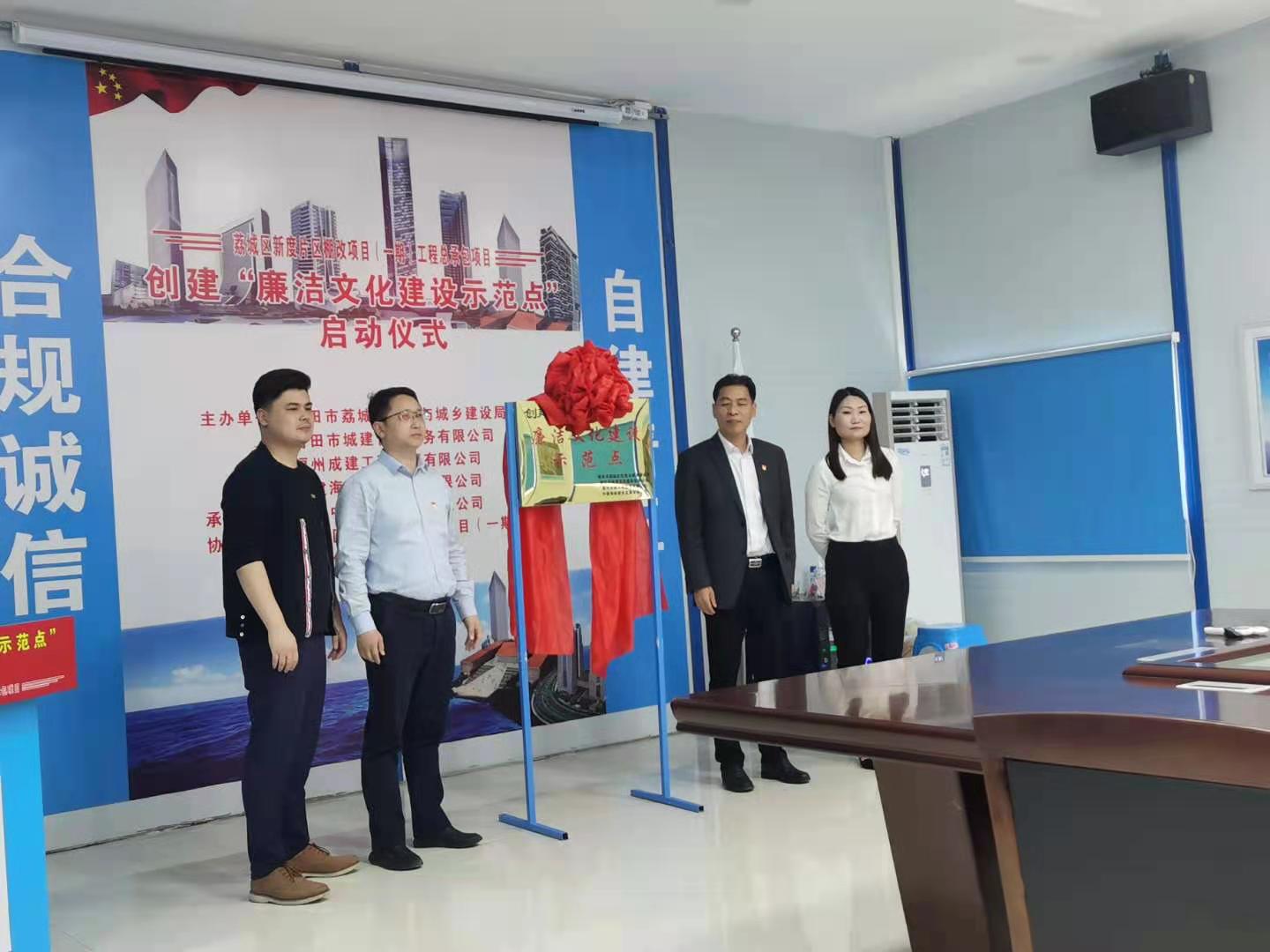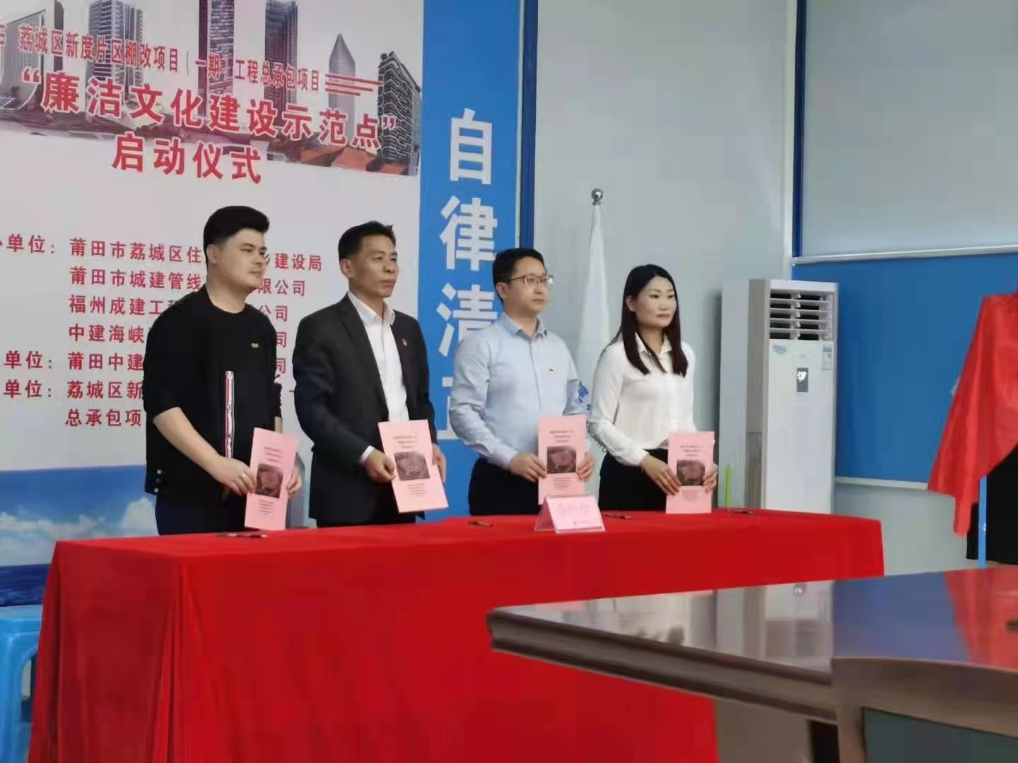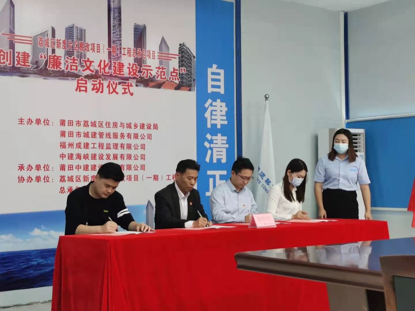 2022年5月18日下午,福州成建工程监理有限公司在莆田市荔城区新度片区棚改项目(一期)工程总承包项目举行廉洁文化建设示范点启动仪式暨廉洁共建签约活动,公司副总经理周玉联同莆田市荔城区住建局局长程珍发,莆田市城建管线服务有限公司总经理陈万气,莆田中建建设发展有限公司董事长修兴敏,在会场签署“廉洁文化建设示范点”联建共建意见书,并为“廉洁文化建设示范点”揭牌。