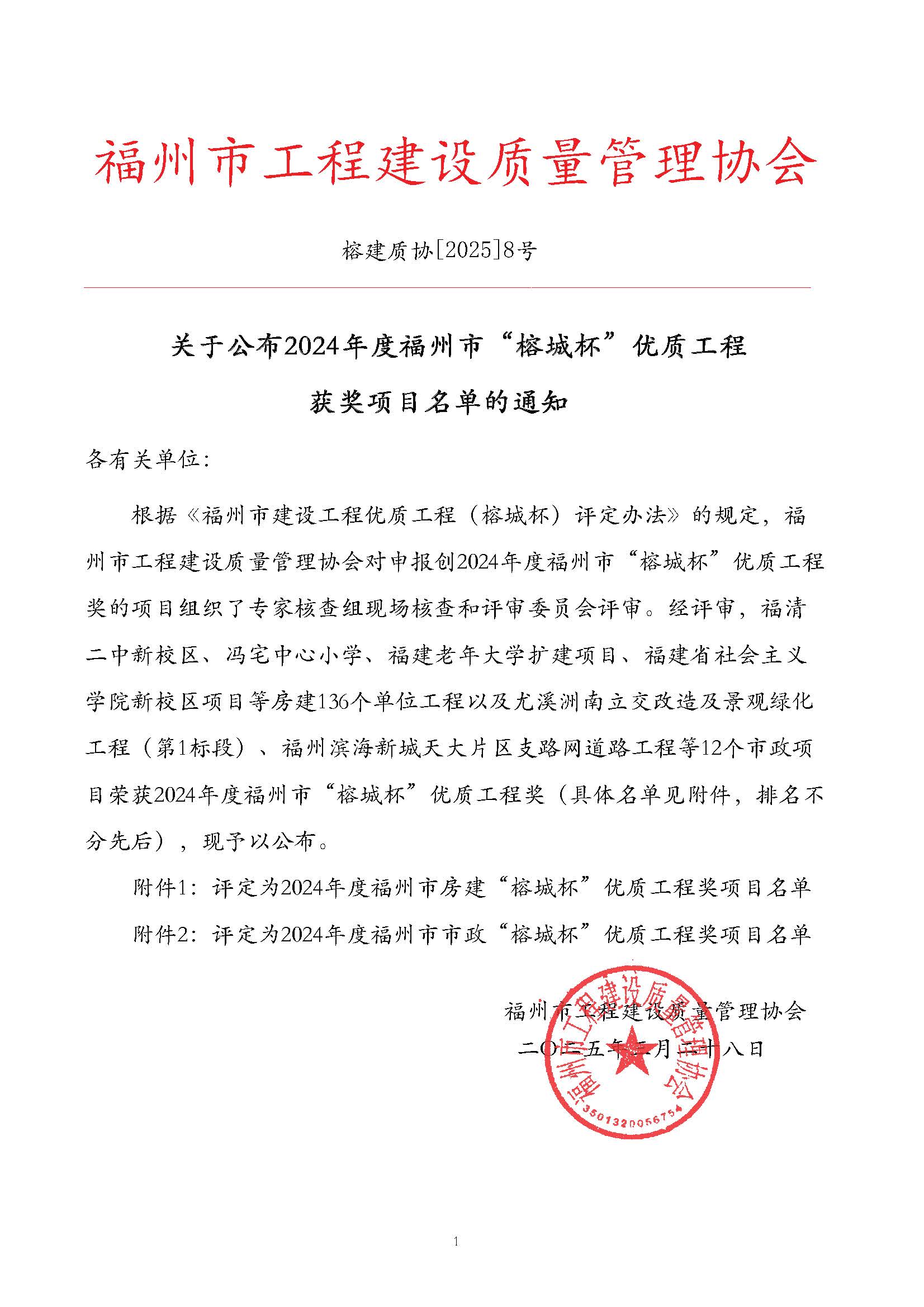 喜讯!获得2024年度福州市“榕城杯”优质工程